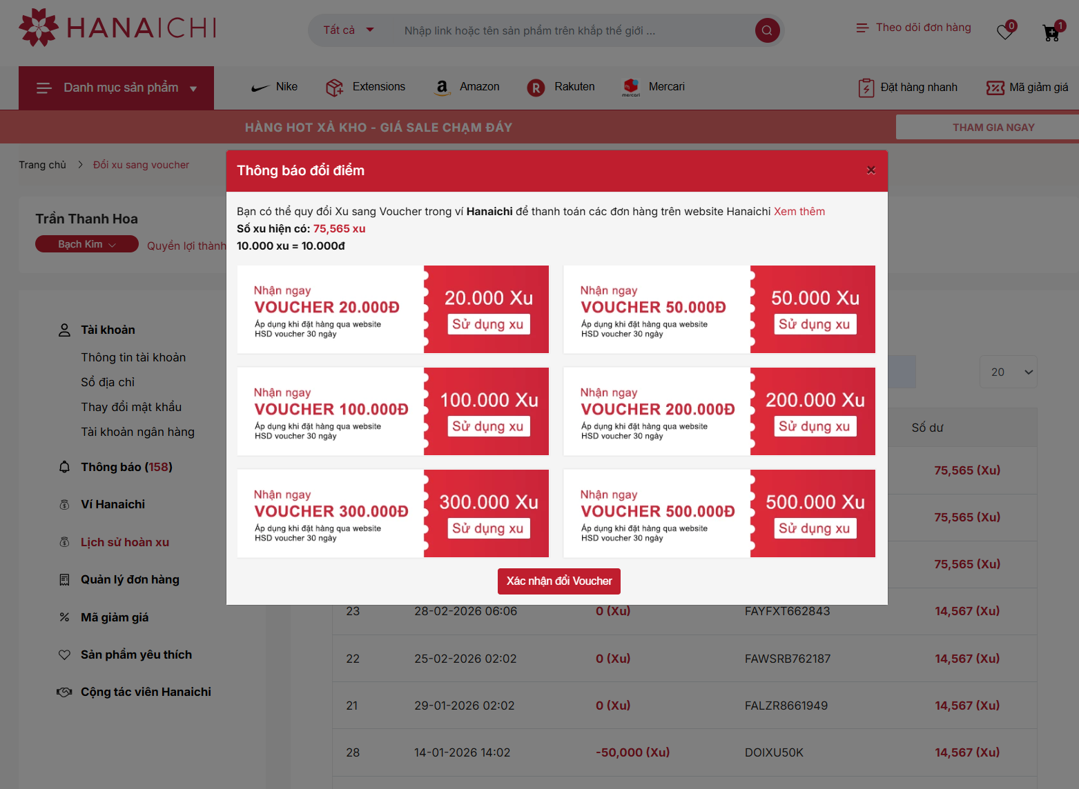 Để sử dụng xu hoàn từ những đơn hoàn đã tích lũy, khách hàng có thể quy đổi thành voucher tương ứng để mua hàng trên website Hanaichi.